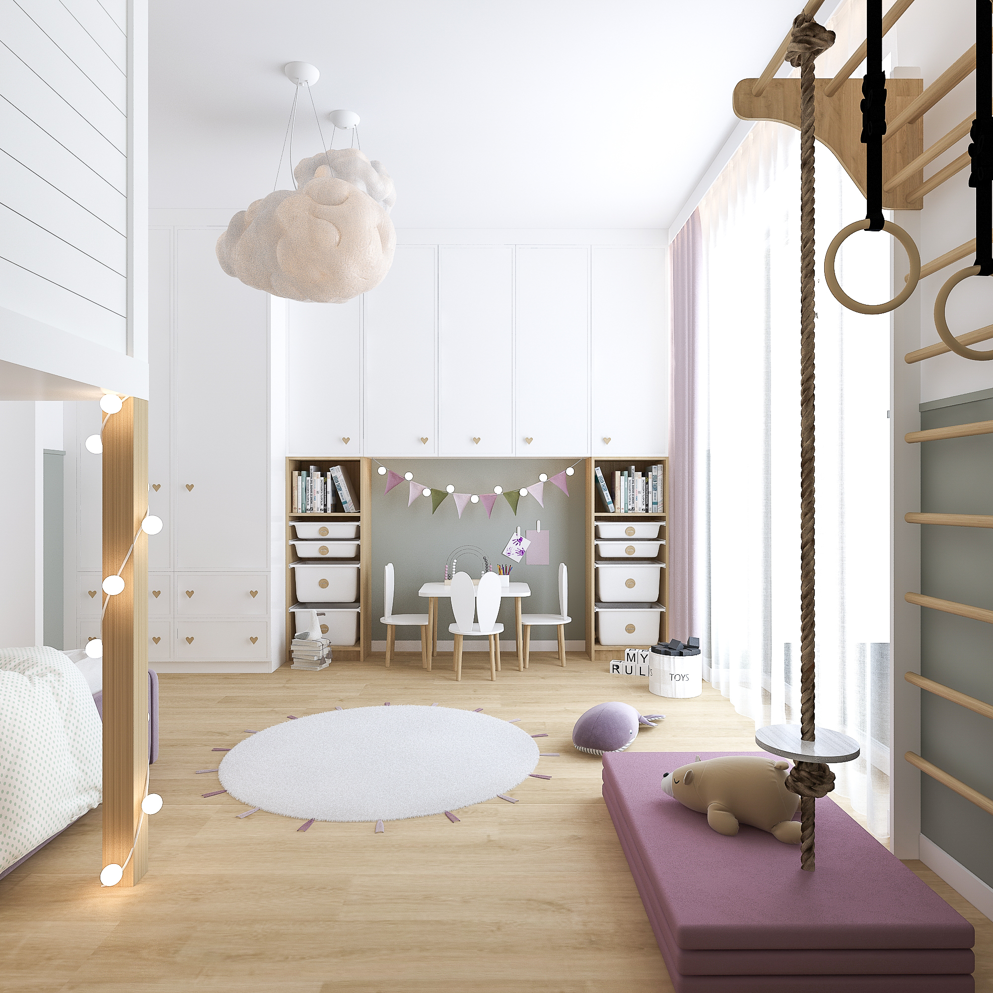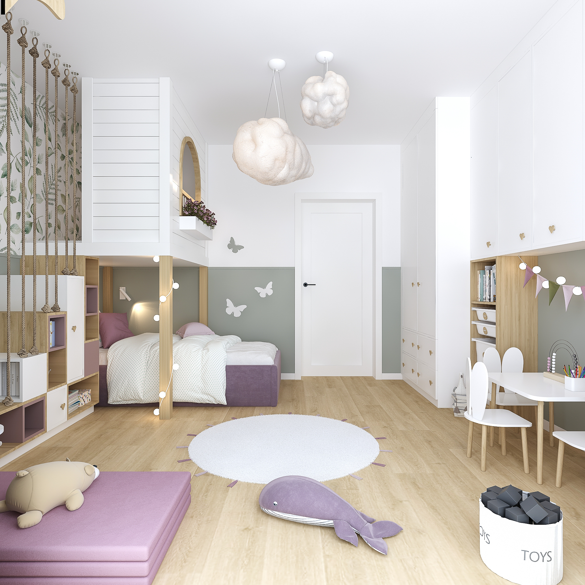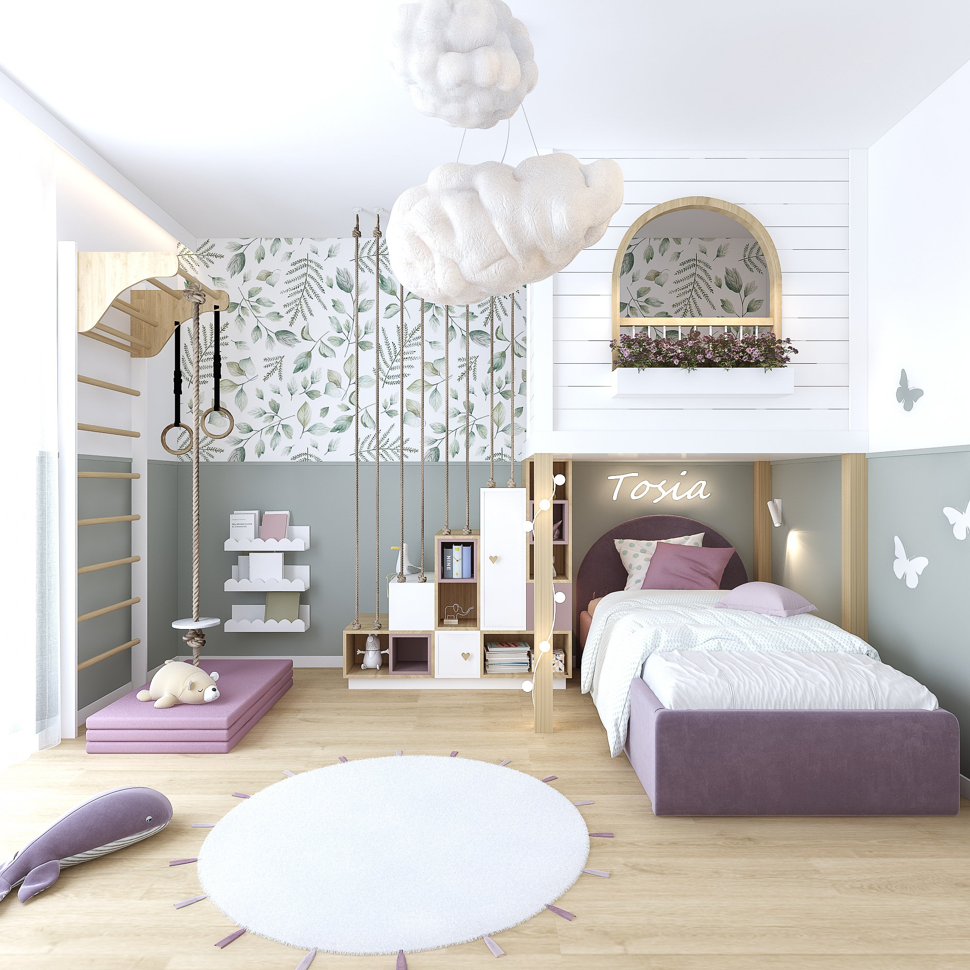 W aranżacji dominują pastelowe odcienie fioletu i mięty, które tworzą spokojną, ale radosną atmosferę. Subtelne dekoracje i dodatki nadają wnętrzu indywidualny charakter, jednocześnie wspierając dziecięcy rozwój i kreatywność.